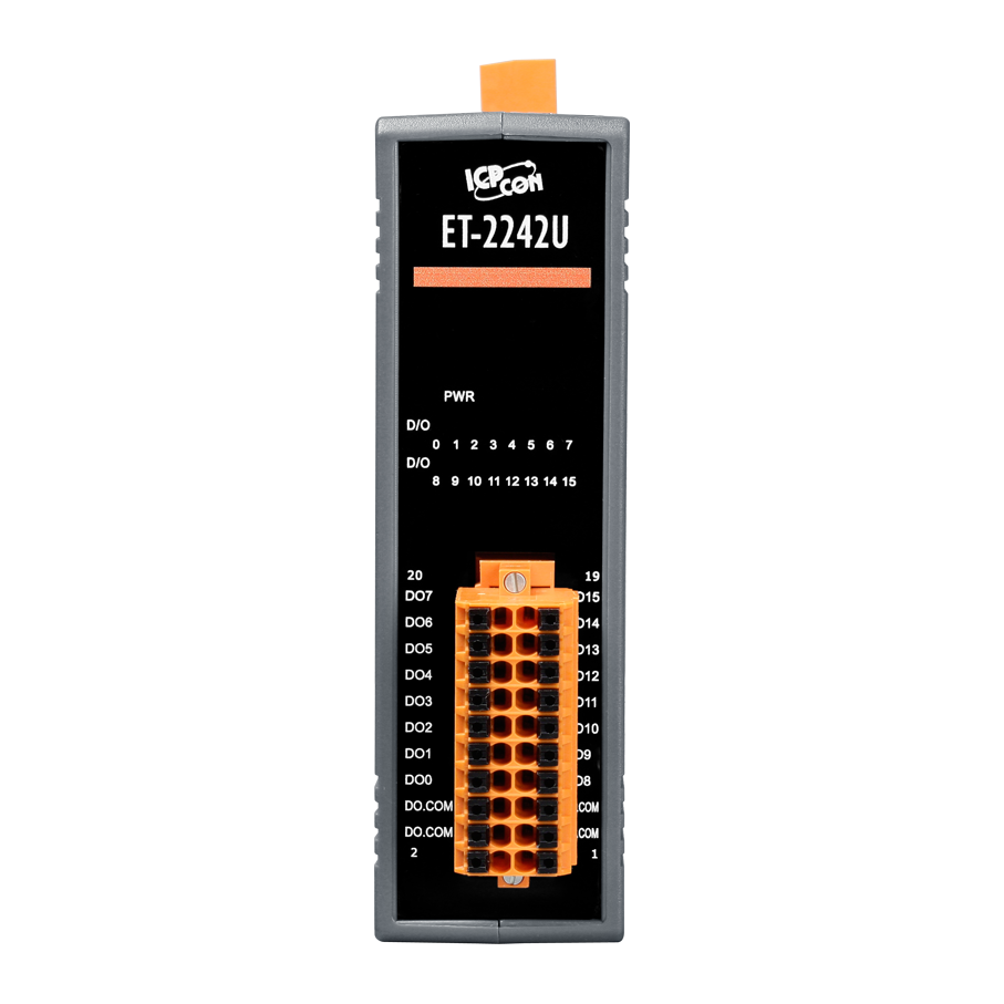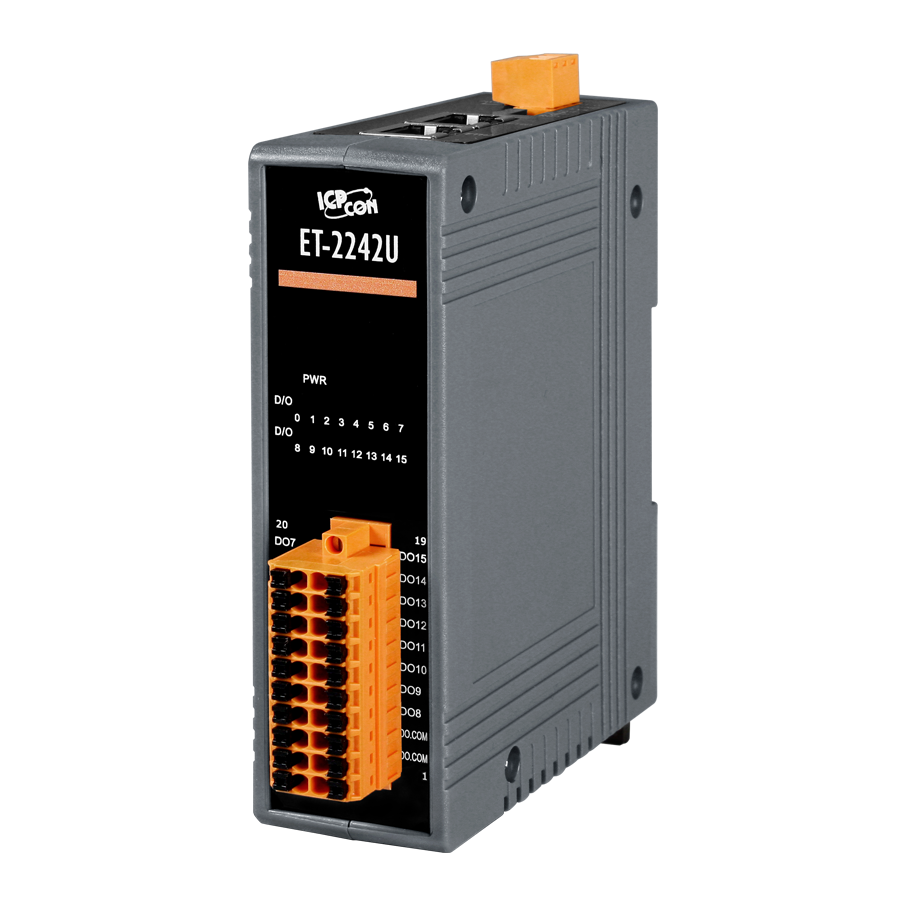 Модуль ET-2242U CR от ICP DAS представляет собой Ethernet-модуль ввода-вывода с 16 каналами цифрового выхода (DO) типа "Push-Pull", поддерживающий режимы Sink и Source. Каждое из 16 выходных реле способно управлять нагрузкой до 500 мА, что обеспечивает гибкость в подключении различных устройств. Встроенный 2-портовый Ethernet-коммутатор (LAN Bypass) позволяет организовать топологию "цепочка" (daisy-chain), упрощая монтаж и снижая затраты на инфраструктуру. Модуль поддерживает промышленные протоколы Modbus TCP, Modbus UDP, MQTT и SNMP V2c, что обеспечивает совместимость с широким спектром промышленного оборудования. Для повышения надежности в промышленных условиях предусмотрены функции защиты от перенапряжений, электростатических разрядов (ESD) и электромагнитных помех (EFT), а также изоляция каналов внутренней логики на уровне 3000 В постоянного тока. Дополнительные функции включают сторожевой таймер, встроенный веб-сервер и возможность парного соединения, что расширяет функциональность и гибкость применения модуля в различных промышленных системах.