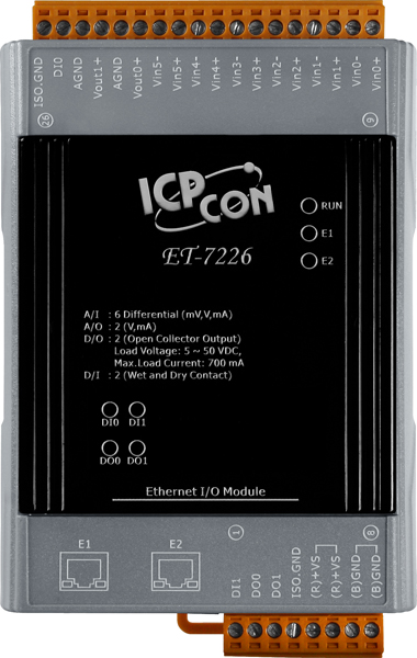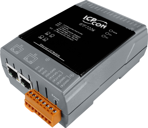 Модуль ET-7226 CR от ICP DAS представляет собой промышленное устройство ввода-вывода с двумя портами Ethernet, оснащённое встроенным 2-портовым Ethernet-коммутатором. Он обеспечивает 6 каналов аналогового ввода, 2 канала аналогового вывода, 2 канала дискретного ввода и 2 канала дискретного вывода, что делает его универсальным решением для различных задач автоматизации.