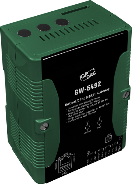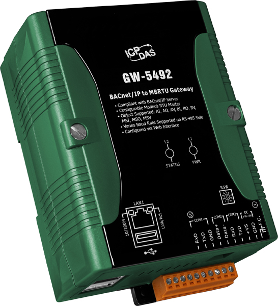Преобразователь GW-5492 от компании ICP DAS представляет собой шлюз протоколов, обеспечивающий интеграцию устройств, работающих по протоколу Modbus RTU, в сети BACnet/IP. Это решение предназначено для эффективного обмена данными между различными системами автоматизации зданий, такими как системы отопления, вентиляции и кондиционирования воздуха (HVAC), системы освещения, контроля доступа и противопожарной сигнализации.
