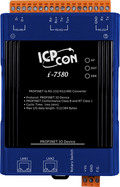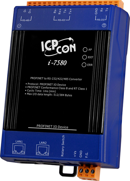 Преобразователь I-7580 CR от ICP DAS предназначен для интеграции устройств с последовательными интерфейсами RS-232, RS-422 и RS-485 в сети PROFINET. Это устройство обеспечивает эффективную связь между промышленными устройствами и системами автоматизации, поддерживая протокол PROFINET IO Device с классом соответствия B и классом RT 1, что гарантирует высокую надежность и быстродействие передачи данных.