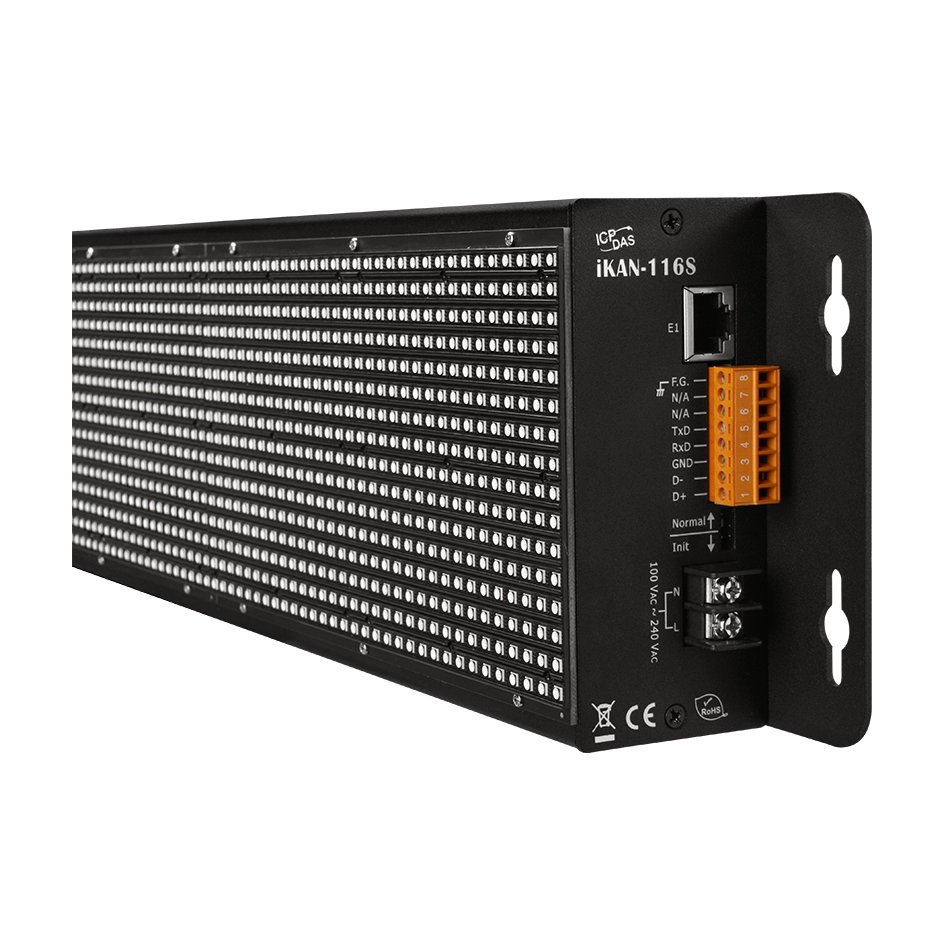 Дисплей iKAN-116S от компании ICP DAS представляет собой промышленный светодиодный индикатор, предназначенный для отображения текстовой информации в реальном времени. Устройство оснащено одним рядом символов и поддерживает отображение 16 символов в формате ASCII или 8 символов в формате Unicode, что обеспечивает гибкость в выборе кодировки в зависимости от требований приложения.