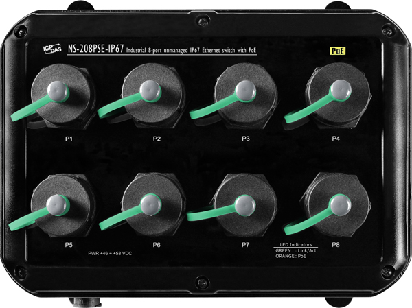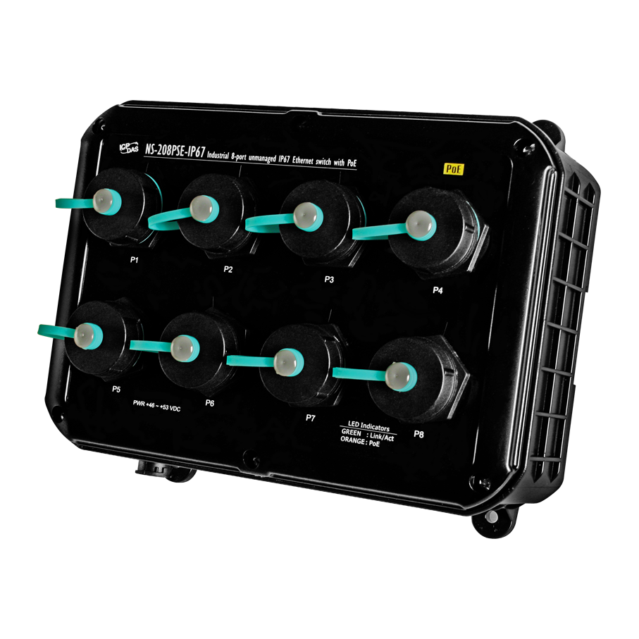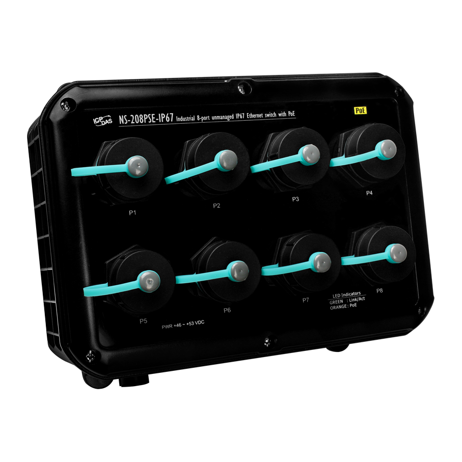 Коммутатор NS-208PSE-IP67 CR Industrial от ICP DAS представляет собой промышленный 8-портовый неуправляемый Ethernet-коммутатор с поддержкой PoE, предназначенный для эксплуатации в условиях повышенной влажности и пыли, соответствующий стандарту защиты IP67.