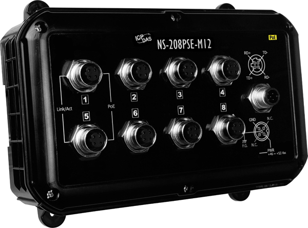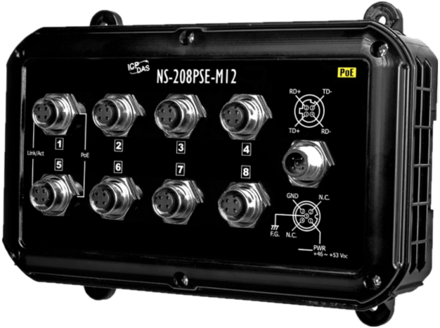 Коммутатор NS-208PSE-M12-IP67 от ICP DAS представляет собой промышленное устройство с 8 портами Ethernet, оснащёнными разъёмами M12, поддерживающими стандарты IEEE 802.3 для 10BaseT и IEEE 802.3u для 100BaseT(X). Каждый порт обеспечивает передачу данных на скорости до 100 Мбит/с и поддерживает функцию Power over Ethernet (PoE) с максимальной мощностью 15,4 Вт на порт, соответствуя стандарту IEEE 802.3af. Это позволяет одновременно передавать данные и питание к подключённым устройствам, таким как IP-камеры, точки доступа Wi-Fi и другие PoE-совместимые устройства, что упрощает установку и снижает затраты на дополнительное электропитание.