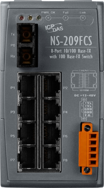 Коммутатор NS-209FCS CR от ICP DAS предназначен для обеспечения надежной и эффективной передачи данных в промышленных Ethernet-сетях. Это неуправляемое устройство уровня 2 (L2) оснащено 8 портами 10/100Base-TX (RJ-45) и одним оптоволоконным портом 100Base-FX (SC-коннектор), что позволяет интегрировать его в различные сетевые инфраструктуры.