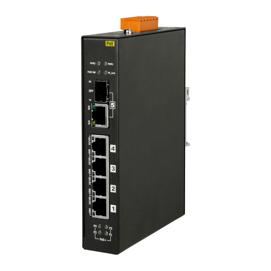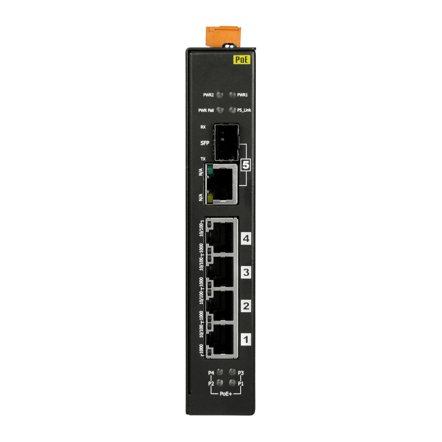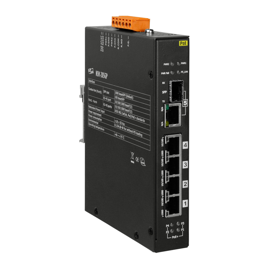 Коммутатор ICP DAS NSM-205GP CR представляет собой промышленное неуправляемое устройство уровня L2, оснащённое пятью портами Ethernet. Из них четыре порта поддерживают технологию Power over Ethernet Plus (PoE+), обеспечивая питание подключённых устройств, таких как IP-камеры или точки доступа Wi-Fi, без необходимости отдельного источника питания. Пятый порт является комбинированным, позволяя использовать как медные соединения через разъём RJ-45, так и оптоволоконные модули SFP для гибкости в выборе типа подключения.