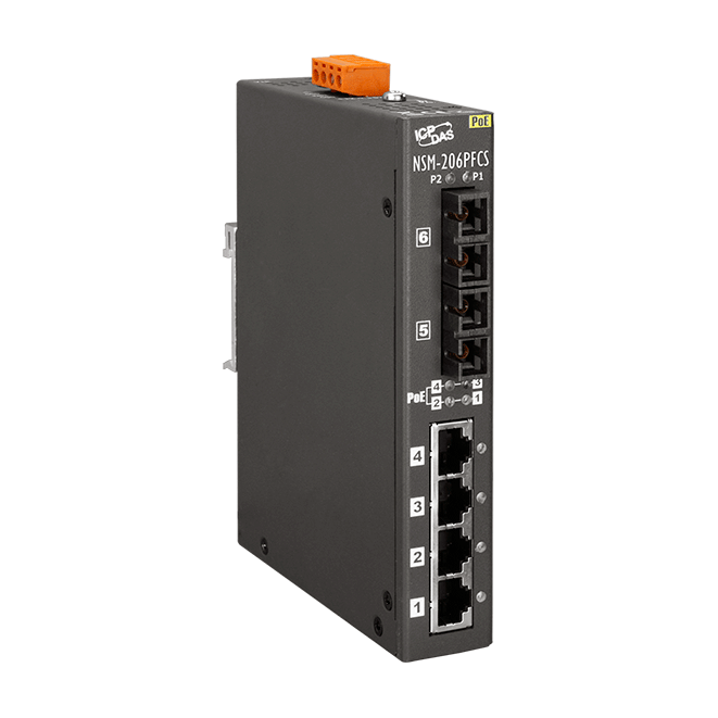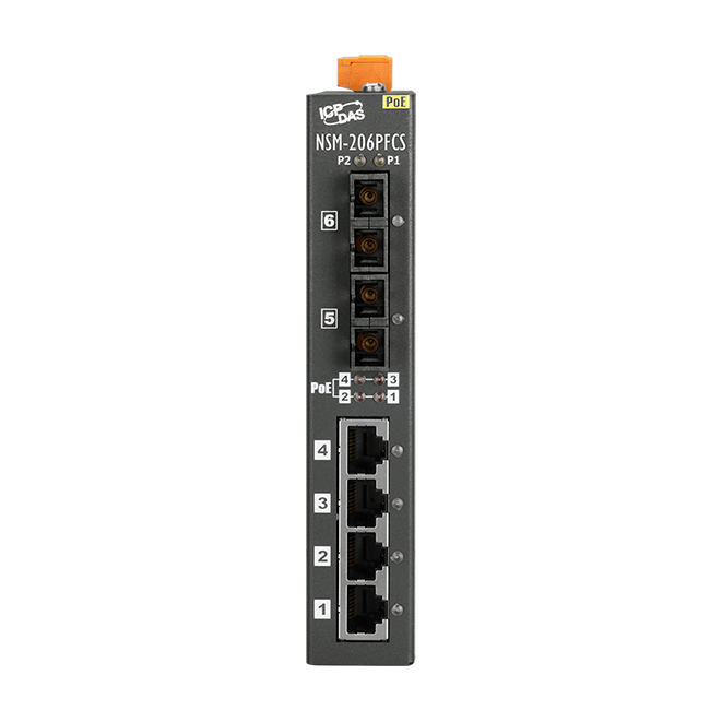 Коммутатор NSM-206PFCS CR от ICP DAS представляет собой промышленное устройство уровня 2 (L2), предназначенное для обеспечения надежной и эффективной передачи данных в различных промышленных сетях. Он оснащен шестью портами: четырьмя портами 10/100Base-TX с поддержкой PoE (PSE) и двумя портами 100Base-FX для подключения по одномодовому оптоволокну с разъемами SC.