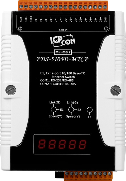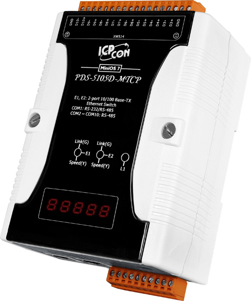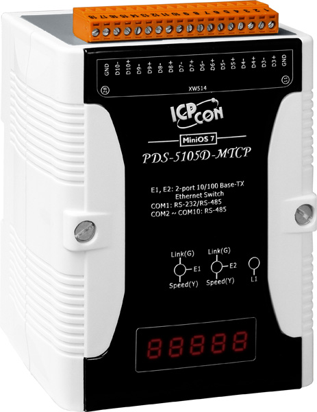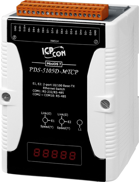 Сервер PDS-5105D-MTCP CR от ICP DAS представляет собой программируемое устройство, предназначенное для преобразования протоколов Modbus RTU/ASCII в Modbus TCP. Он оснащён 10 последовательными портами, из которых 9 являются RS-485, а 1 может работать как RS-232/485, а также двумя портами Ethernet с функцией LAN Bypass, обеспечивающими непрерывность связи при выходе устройства из строя.