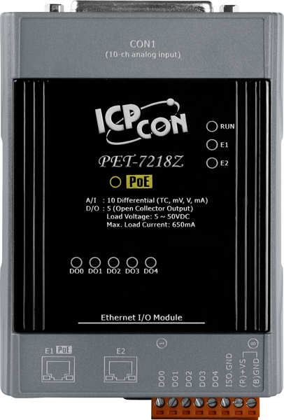 Модуль PET-7218Z/S CR от компании ICP DAS представляет собой Ethernet-устройство ввода-вывода, оснащённое 10 дифференциальными каналами для подключения термопар и 5 каналами дискретного вывода. Встроенный 2-портовый Ethernet-коммутатор обеспечивает возможность последовательного соединения нескольких устройств, что упрощает построение распределённых систем. Питание модуля осуществляется через PoE (Power over Ethernet) по стандарту IEEE 802.3af, Class1, а также через терминальную клемму с диапазоном входного напряжения от 12 до 48 В постоянного тока. Максимальное потребление тока составляет 3,3 Вт, что делает устройство энергоэффективным и удобным для использования в различных промышленных приложениях.