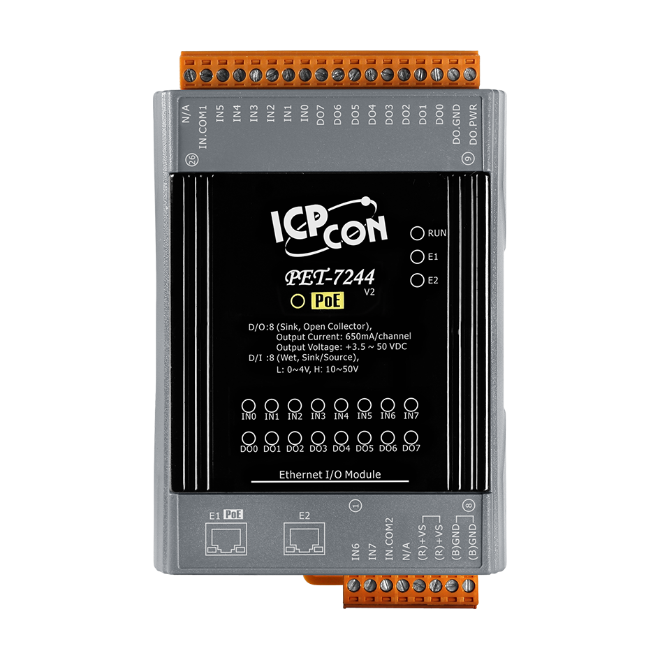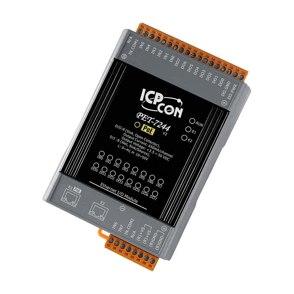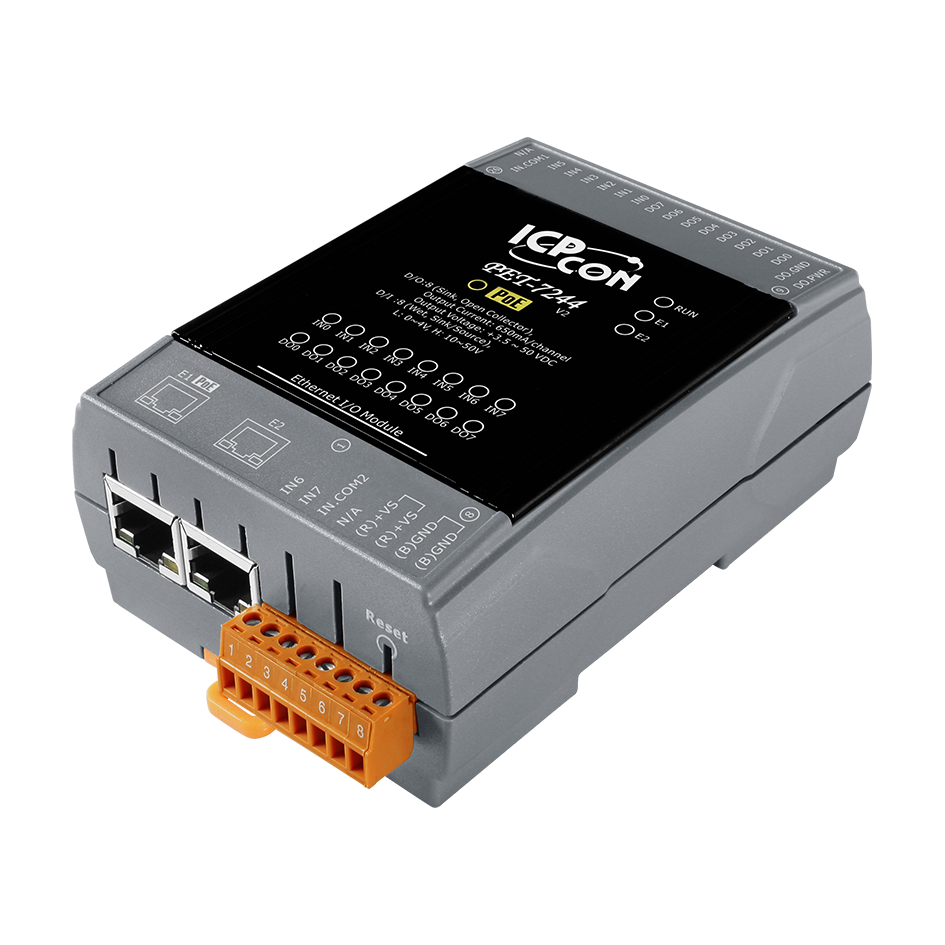 Модуль PET-7244 CR от ICP DAS представляет собой промышленный Ethernet-модуль ввода-вывода с двумя портами Ethernet и встроенным 2-портовым Ethernet-коммутатором. Он оснащён 8 каналами цифрового ввода и 8 каналами цифрового вывода, что делает его подходящим для различных задач автоматизации и мониторинга в промышленной сфере.