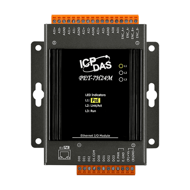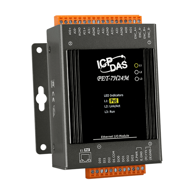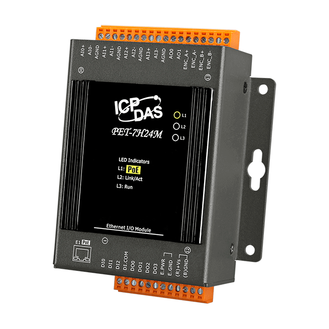 Модуль PET-7H24M CR от компании ICP DAS представляет собой высокоскоростной Ethernet-модуль сбора данных, оснащенный 4 дифференциальными аналоговыми входами с 24-битным разрешением, 2 аналоговыми выходами, 3 дискретными входами и 4 дискретными выходами. Также предусмотрен 1 канал для подключения энкодера, что расширяет возможности модуля в промышленных приложениях.