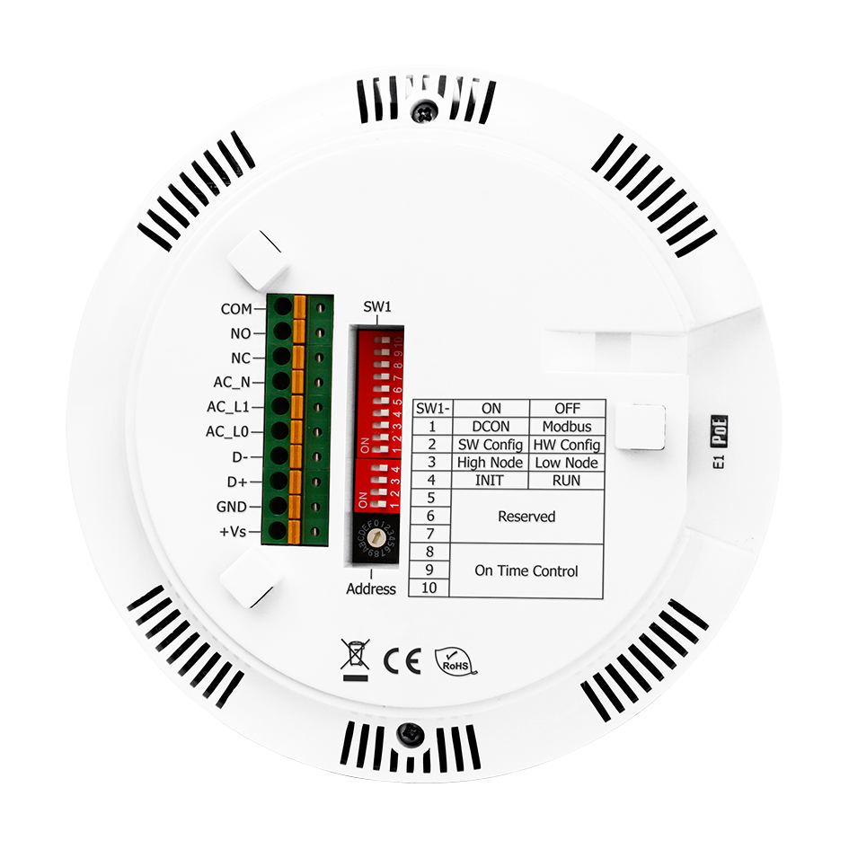 - Релейный выход: 1 канал с силовым реле Form C, нагрузочной способностью 10 А при 250 В переменного тока, обеспечивающий управление внешними устройствами, такими как освещение или системы вентиляции.