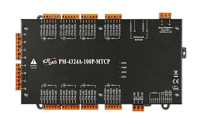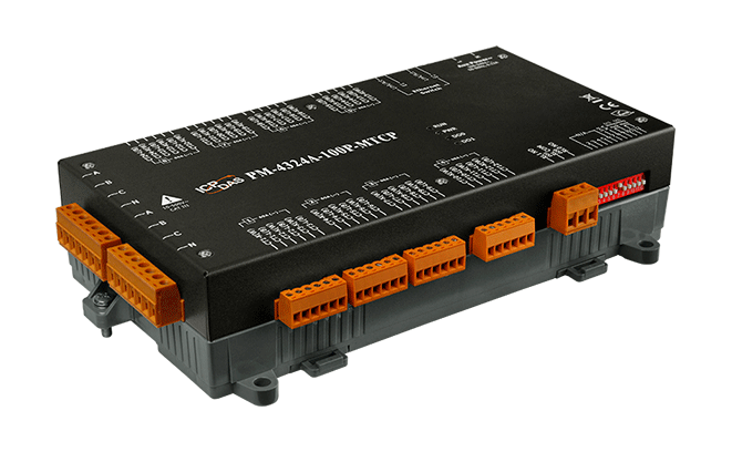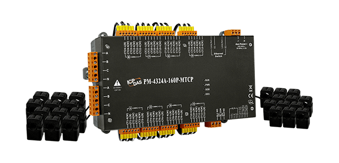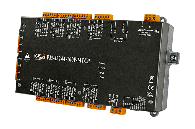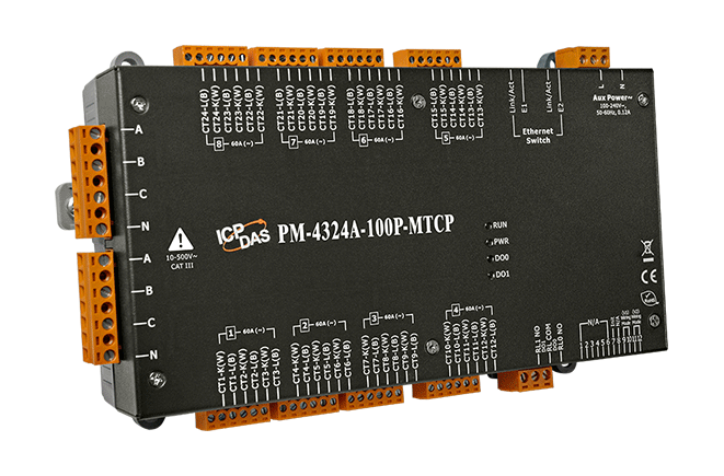 Измеритель PM-4324A-100P-MTCP CR от компании ICP DAS представляет собой интеллектуальный многоканальный прибор для измерения параметров электрической сети. Он оснащён 24 трансформаторами тока (CT) с внутренним диаметром 10 мм, что позволяет осуществлять мониторинг до 24 однофазных цепей или 8 трёхфазных цепей одновременно.