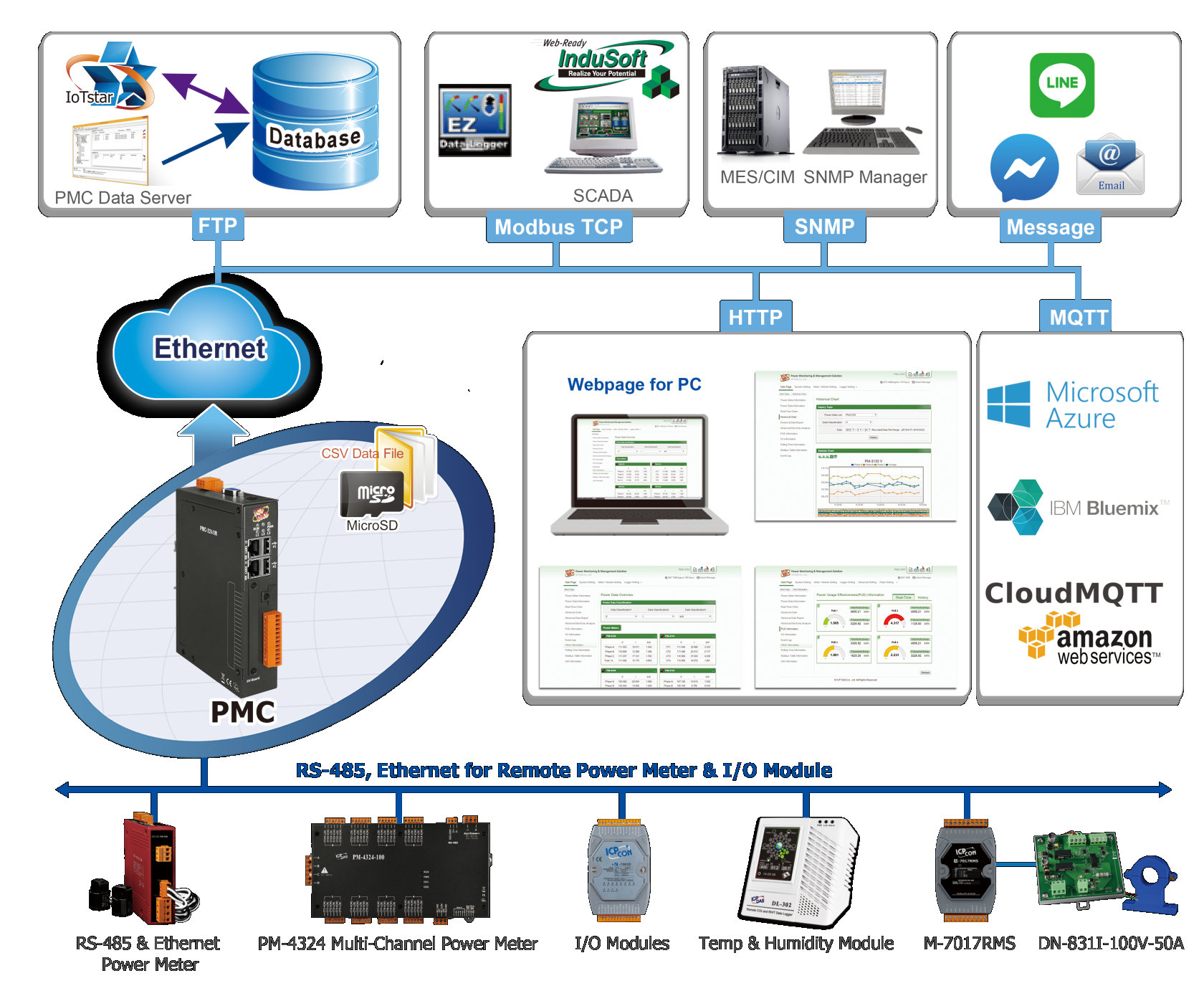 - Гибкость подключения: поддержка до 24 модулей измерения мощности ICP DAS и 8 модулей ввода-вывода Modbus, что позволяет адаптировать систему под конкретные требования.