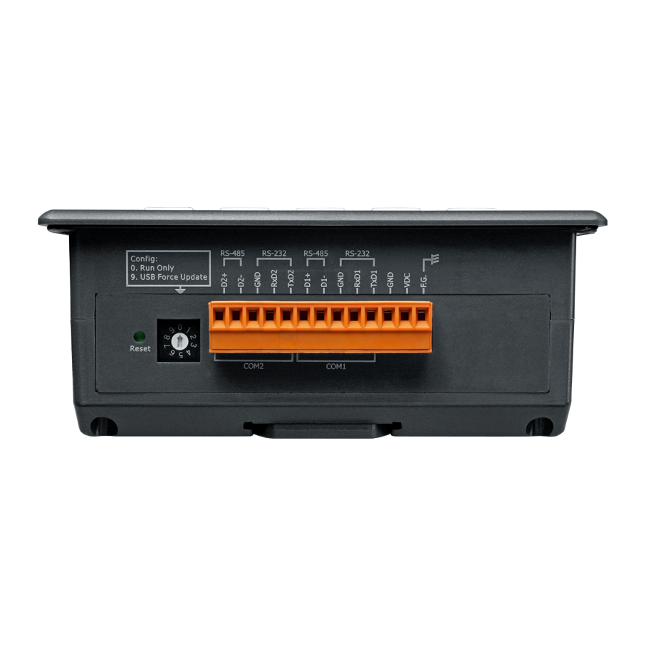 Монтаж панели возможен как на DIN-рейку, так и в панельный монтаж, что обеспечивает гибкость в установке. Лицевая панель защищена по стандарту NEMA4/IP65, обеспечивая надежную защиту от пыли и влаги. Рабочая температура устройства составляет от -20 до +50°C, а температура хранения — от -30 до +80°C, что позволяет использовать его в различных климатических условиях. Рабочая влажность составляет от 10 до 90% без образования конденсата, что расширяет область применения устройства.
