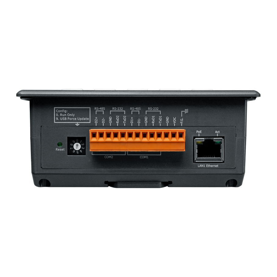 Устройство оснащено двумя портами RS-232/RS-485, что позволяет интегрировать его в системы с различными интерфейсами передачи данных. Наличие порта Ethernet 10/100 Base T(X) расширяет возможности подключения к промышленным сетям. Встроенные часы реального времени (RTC) обеспечивают точную синхронизацию времени, необходимую для мониторинга и управления процессами. Панель поддерживает питание по технологии Power over Ethernet (PoE) согласно стандарту IEEE 802.3af, Class 1, что упрощает установку и снижает количество проводов. Рабочее напряжение устройства составляет 12–48 В постоянного тока, что обеспечивает гибкость при выборе источника питания.