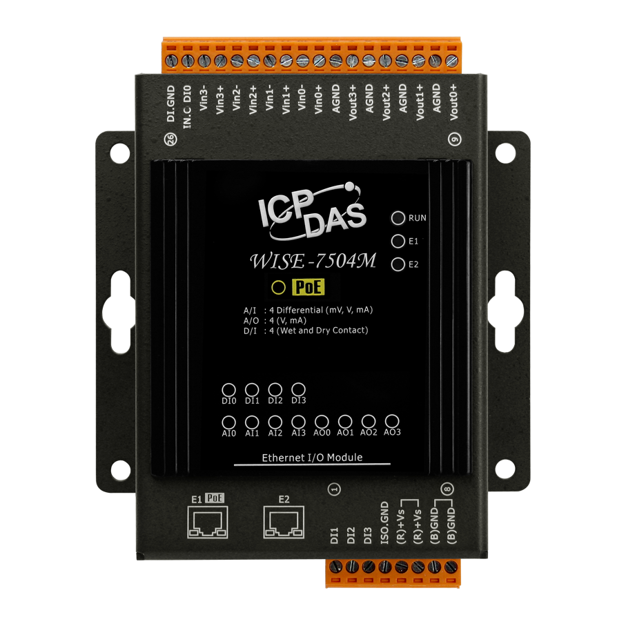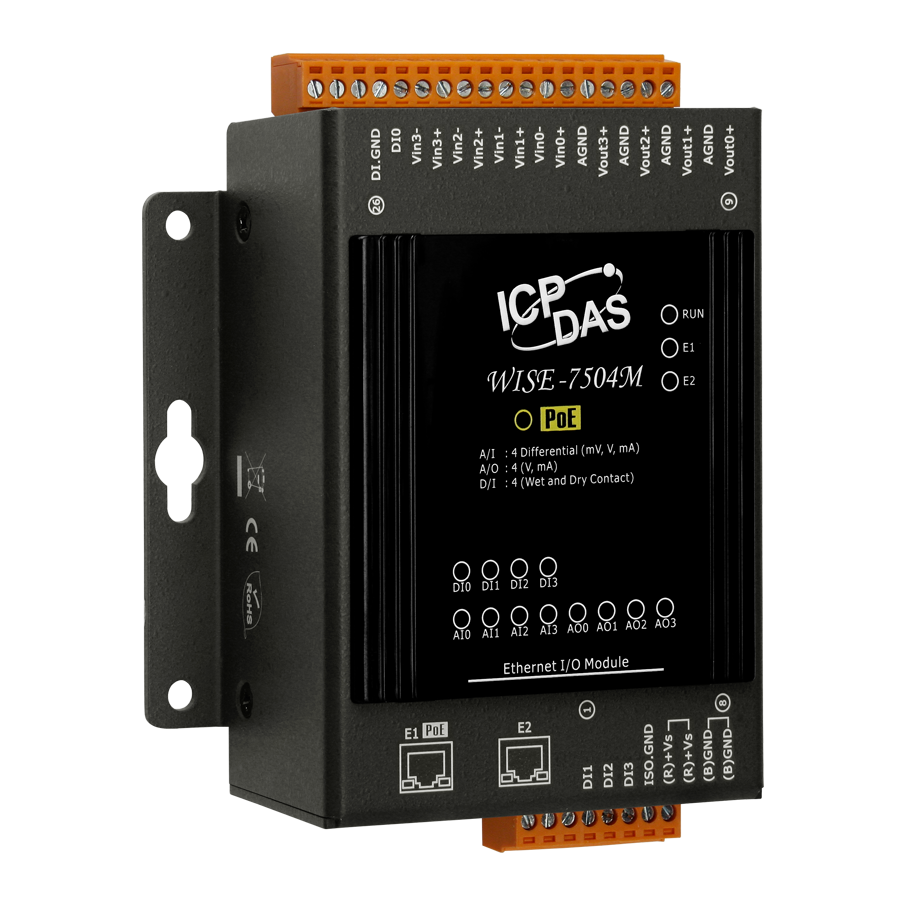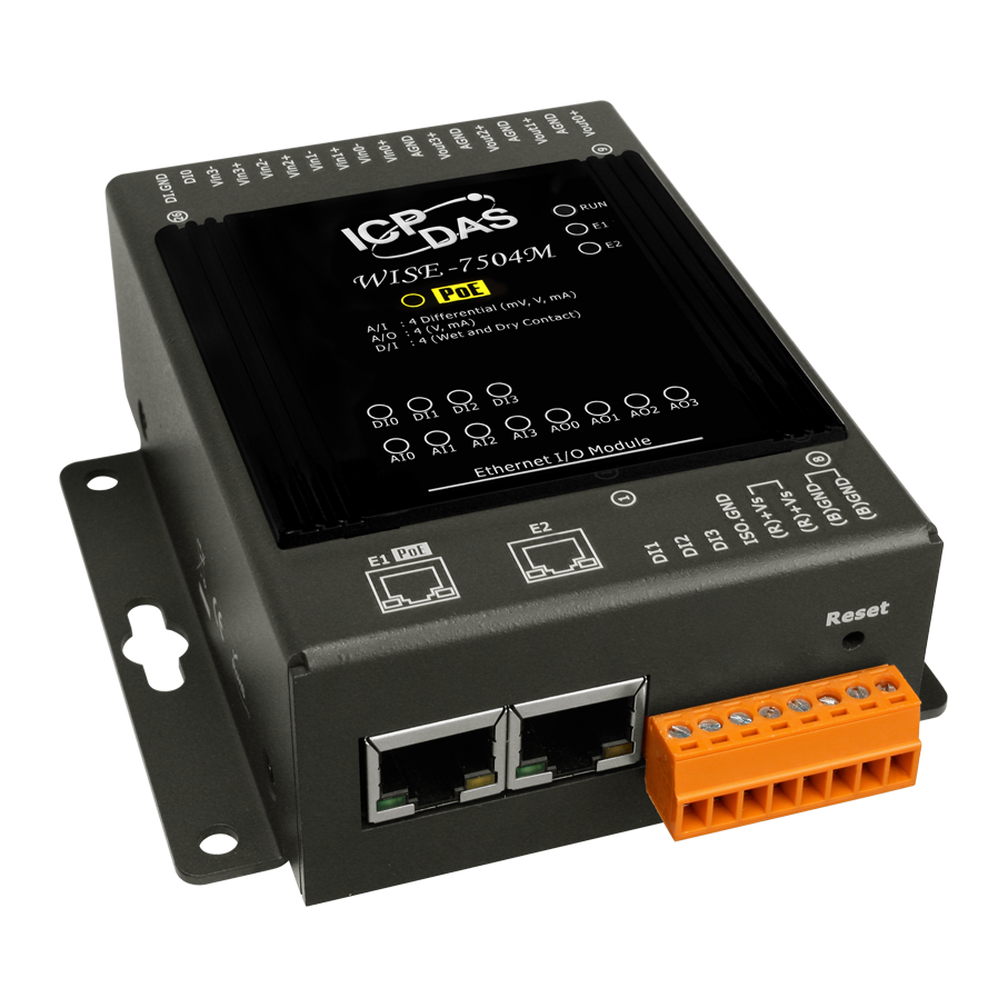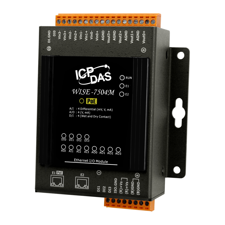 Модуль WISE-7504M от ICP DAS представляет собой интеллектуальное устройство ввода-вывода, оснащённое четырьмя каналами аналогового ввода, четырьмя каналами аналогового вывода, четырьмя каналами дискретного ввода и двумя портами Ethernet. Это решение предназначено для интеграции в системы автоматизации, требующие гибкости и надёжности при сборе и обработке данных.