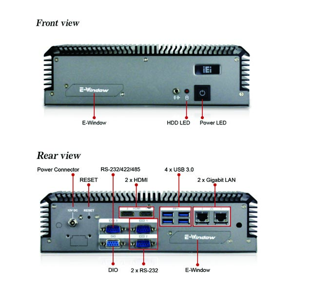 В наличии четыре порта USB 3.x для подключения периферийных устройств, два COM-порта RS-232 и один комбинированный порт RS-232/422/485, что расширяет возможности интеграции с различным промышленным оборудованием. Два порта Gigabit Ethernet обеспечивают высокоскоростное сетевое соединение. Для расширения функциональности предусмотрены два слота Mini PCIe, поддерживающие дополнительные модули, включая опциональные модули Wi-Fi, Bluetooth и LTE.