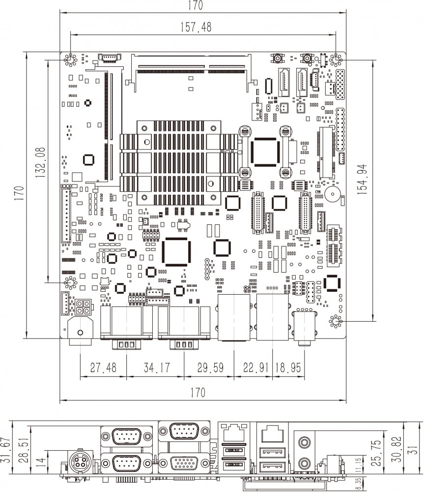 Плата поддерживает до 8 ГБ оперативной памяти DDR3L через два слота SO-DIMM, обеспечивая необходимую производительность для различных приложений. Для расширения функциональности предусмотрены два слота PCIe: x1 и Mini PCIe, а также два порта SATA II для подключения накопителей. Видеовыходы включают VGA и два канала LVDS, что позволяет подключать различные дисплеи и мониторы.