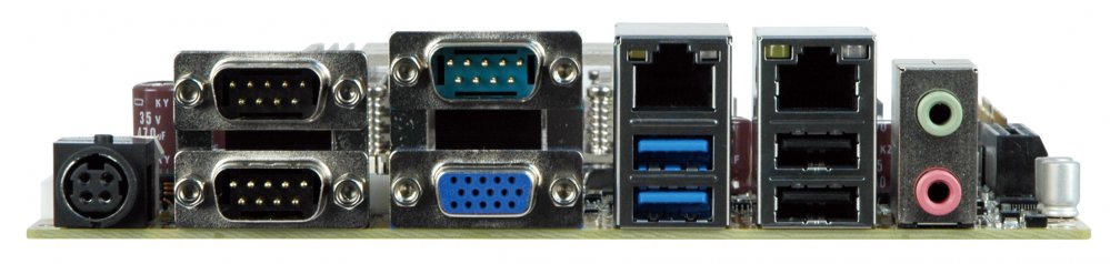 Сетевые возможности представлены двумя портами Ethernet 10/100/1000 Мбит/с (RJ-45), обеспечивающими стабильное подключение к сети. Для подключения периферийных устройств предусмотрены четыре порта USB 2.0 и два порта USB 3.0. Дополнительные интерфейсы включают четыре порта COM (RS-232), один порт RS-422/485, цифровой вход/выход (GPIO) и SMBus, что расширяет возможности интеграции с различным оборудованием.