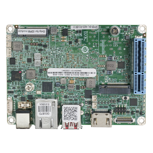 Для хранения данных предусмотрены интерфейсы SATA III (6 Гбит/с) и M.2 Key M 2242, обеспечивая гибкость в выборе накопителей. Сетевые возможности включают один порт 2,5 Гбит/с Ethernet на базе контроллера Intel® I225V, обеспечивая высокоскоростное подключение к сети. Видеовыходы HDMI и iDPM поддерживают разрешение до 4096 x 2160 пикселей, что подходит для подключения к современным дисплеям.