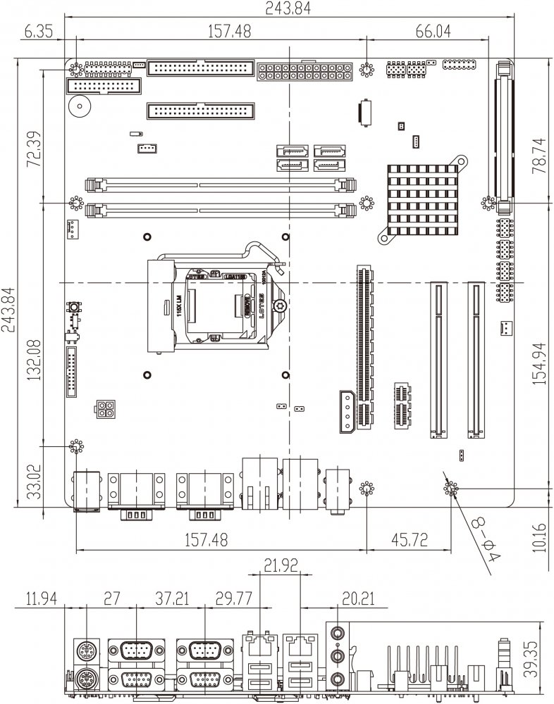- Порты ввода/вывода: два внешних порта USB 2.0, два внешних порта USB 3.2 Gen1x1, один PS/2, один LPT, два порта RS-232 (внешних) и один порт RS-422/485 (внутренний).