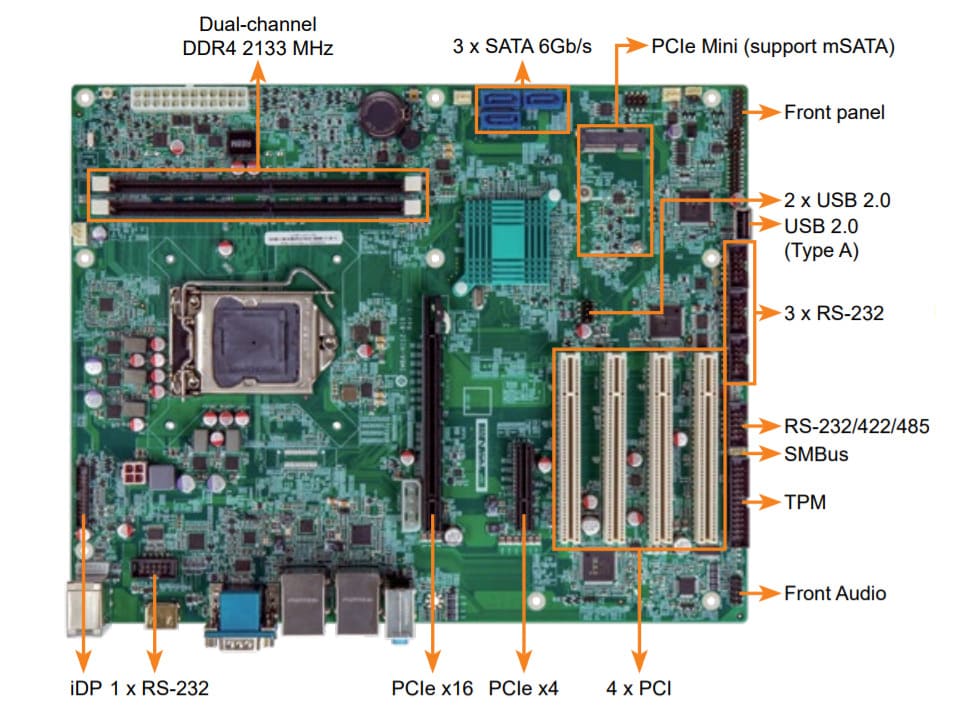 Плата оснащена двумя слотами для оперативной памяти DDR4-2133, поддерживающими до 64 ГБ, что позволяет эффективно работать с ресурсоемкими приложениями. Для отображения видеосигнала предусмотрены интерфейсы VGA, HDMI 1.4 и iDP, совместимые с модулями HDMI, LVDS, VGA, DVI и DP. Два порта Gigabit Ethernet обеспечивают высокоскоростное сетевое подключение, а пять последовательных портов RS-232 и один комбинированный порт RS-232/422/485 позволяют интегрировать различные периферийные устройства.