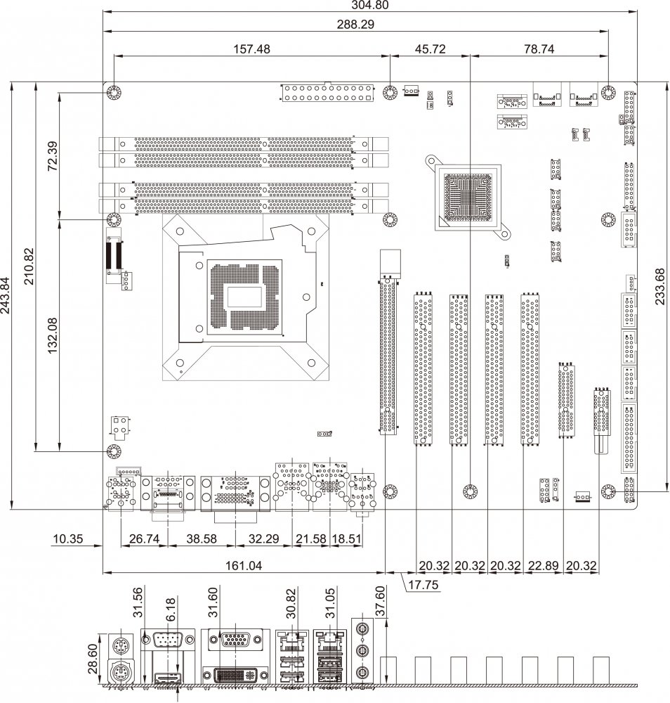 Плата оснащена четырьмя слотами для оперативной памяти DDR3 SDRAM с частотой 1066/1333 МГц, поддерживающими до 32 ГБ в двухканальном режиме. Для расширения функциональности предусмотрены различные слоты: один PCIe x16, один PCIe x4, один PCIe x1 и четыре PCI. Это позволяет интегрировать дополнительные карты, такие как видеокарты, карты захвата видео, контроллеры ввода-вывода и другие периферийные устройства.