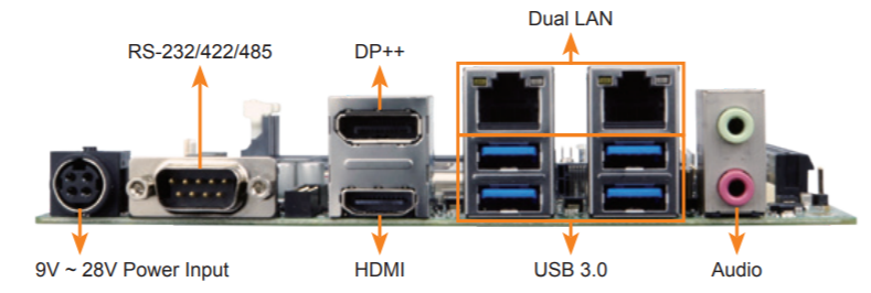 Плата оснащена двумя независимыми дисплейными интерфейсами: HDMI и DisplayPort++, обеспечивая поддержку разрешений до 3840 x 2160 при 60 Гц. Это позволяет подключать два монитора для отображения различных данных или интерфейсов. Для расширения функциональности предусмотрены два порта Gigabit Ethernet (GbE LAN), два порта USB 3.0, четыре порта USB 2.0 (через внутренний разъем), два порта RS-232 и один порт RS-232/422/485, а также интерфейсы I2C, PS/2 и SMBus. Для подключения накопителей доступны два порта SATA III (6 Гбит/с) и слот M.2 B-Key для SSD-накопителей.