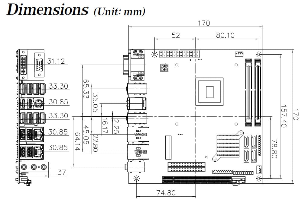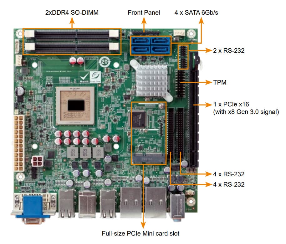 Плата поддерживает до 64 ГБ оперативной памяти DDR4 SO-DIMM с частотой 2666 МГц, что позволяет эффективно работать с ресурсоемкими задачами. Для хранения данных предусмотрены четыре порта SATA III (6 Гбит/с), обеспечивающие быстрый доступ к данным. Видеовыходы VGA и DVI-I поддерживают разрешение до 1920×1080 пикселей, позволяя подключать различные дисплеи для отображения информации.
