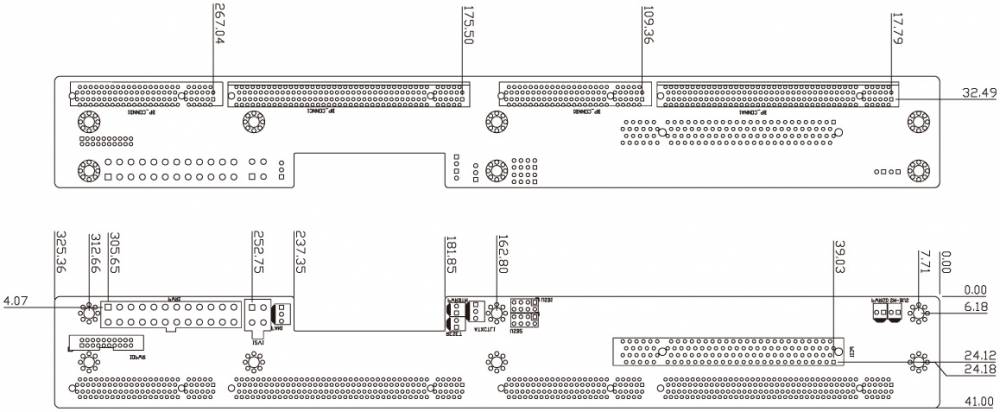 Размеры кроссплаты составляют 41 мм в высоту и 325,36 мм в длину, что соответствует стандарту 1U и обеспечивает компактность при установке в стойку. Входное питание осуществляется через разъемы ATX (24 + 4 контакта) с шагом 4,2 мм, типы MF24 и MF4, что обеспечивает совместимость с большинством стандартных источников питания.