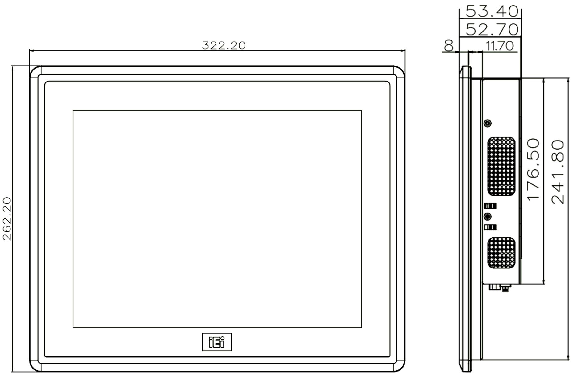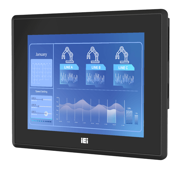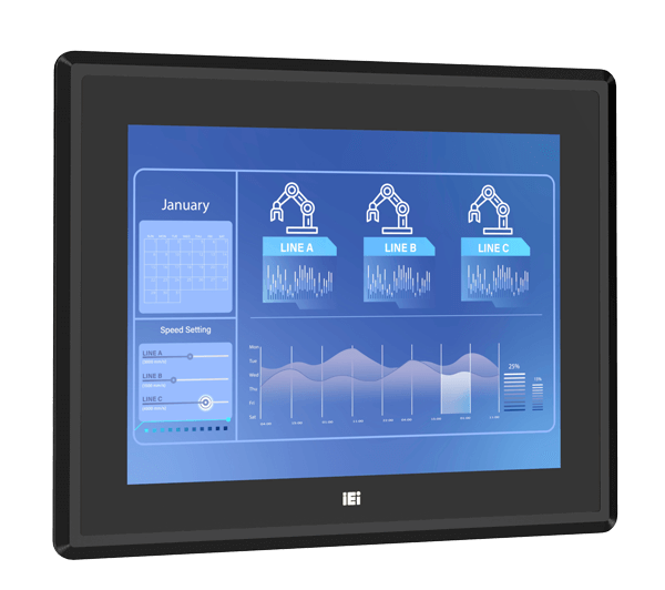 Оснащен 12,1-дюймовым XGA TFT LCD дисплеем с разрешением 1024 x 768 пикселей и проекционно-емкостным сенсорным экраном, поддерживающим 10-точечный мультитач. Передняя панель имеет защиту от пыли и влаги по стандарту IP65, что обеспечивает долговечность в условиях промышленной эксплуатации.