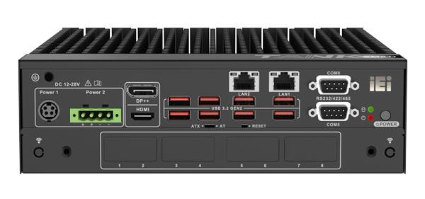 Компьютер оснащен четырьмя портами RS-232 и двумя портами RS-232/422/485 для подключения промышленного оборудования. В наличии восемь портов USB 3.x для подключения периферийных устройств. Сетевые возможности включают четыре порта Ethernet, обеспечивающие стабильное подключение к промышленным сетям. Для вывода видео предусмотрены интерфейсы HDMI и DisplayPort. Дополнительные функции включают сторожевой таймер для автоматического восстановления системы после сбоев.