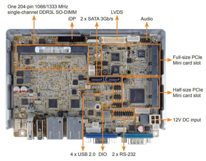 Плата оснащена процессором Intel® Celeron® N2807 с тактовой частотой 1,58 ГГц, выполненным по 22-нм техпроцессу, обеспечивая низкое тепловыделение (4,5 Вт) и эффективную работу в условиях ограниченного пространства. Объем поддерживаемой оперативной памяти DDR3L составляет до 4 ГБ, что позволяет решать задачи средней сложности.