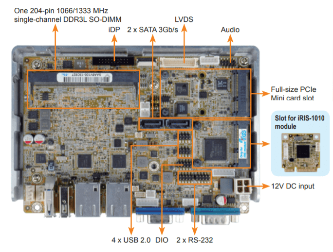 Плата оснащена четырехъядерным процессором Intel® Celeron™ N2930 с тактовой частотой 1,86 ГГц, обеспечивая стабильную работу при максимальном потреблении энергии 17,4 Вт. Она поддерживает до 8 ГБ оперативной памяти DDR3L через слот SO-DIMM. Для хранения данных предусмотрены два порта SATA II (3 Гбит/с) и слот mSATA.