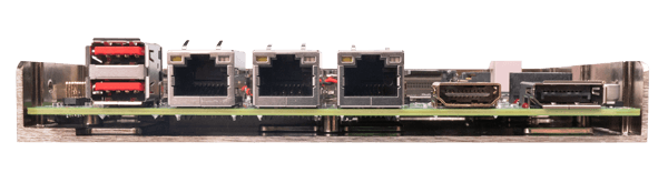Сетевые возможности платы включают три порта Ethernet 2,5 Гбит/с (RJ-45) с контроллером Intel i225V, обеспечивая высокоскоростное подключение для передачи данных. Для расширения функциональности предусмотрены два порта USB 2.0, два порта USB 3.2 Gen 2 x1, два последовательных порта RS-232, а также 12-битный цифровой вход/выход (GPIO) и интерфейс SMBus для подключения различных периферийных устройств и датчиков.