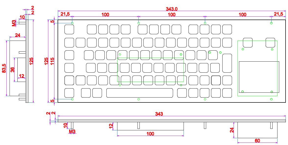 Клавиатура оснащена 81 клавишей с коротким ходом 0,45 мм и купольными позолоченными контактами, что гарантирует ресурс каждой клавиши не менее 1 млн нажатий. Тачпад с емкостной технологией и разрешением 40 точек/мм обеспечивает точное управление указателем. Интерфейсы подключения: PS/2 и USB. Материал передней панели — алюминий с износостойким покрытием. Степень защиты по IP — IP65, что подтверждает защиту от пыли и струй воды. Рабочий температурный диапазон: от -20 до +65°C. Габаритные размеры: 343 х 125 мм; вес: 1,2 кг.