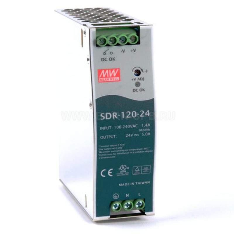 Блок питания Mean Well SDR-120-24 предназначен для преобразования переменного напряжения в постоянное, обеспечивая выходное напряжение 24 В и ток до 5 А при мощности 120 Вт.