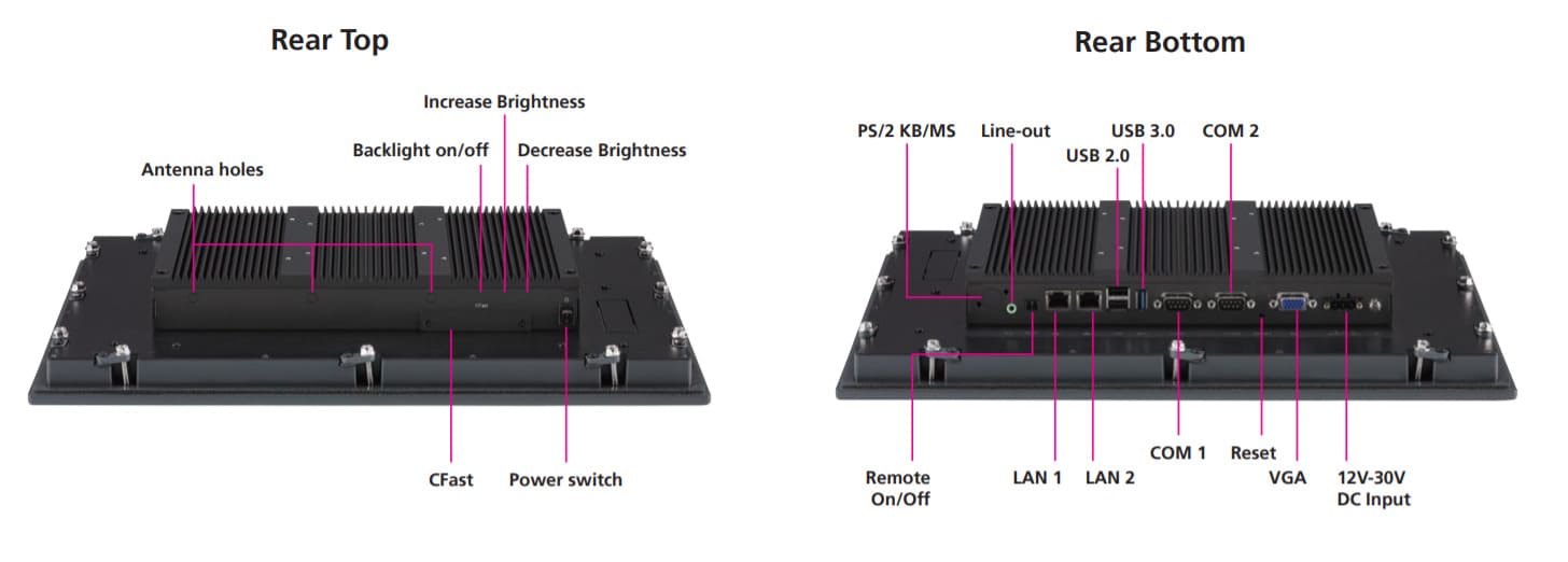 Интерфейсы ввода-вывода включают два порта USB 2.0, один USB 3.0, два COM-порта (RS-232/422/485), аудиовыход и опциональный PS/2. Для расширения функциональности доступны два слота Mini PCIe, поддерживающие модули Wi-Fi, 3G или fieldbus. Питание осуществляется от источника постоянного тока с диапазоном входного напряжения 12–30 В DC.