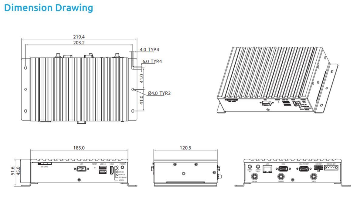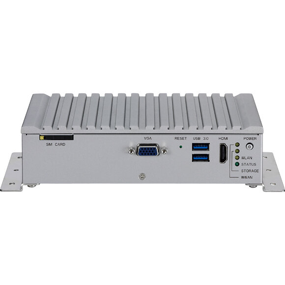 Оснащен двухъядерным процессором Intel Atom® x5-E3930 с тактовой частотой 1,3 ГГц, 4 ГБ оперативной памяти DDR3L и возможностью расширения до 8 ГБ. Для хранения данных предусмотрены два слота: 2,5-дюймовый SSD SATA 3.0 и mSATA. Сетевые возможности включают один порт Ethernet 10/100/1000 Мбит/с (RJ45). Видеоинтерфейсы представлены разъемами VGA и HDMI. Для подключения периферийных устройств имеются два порта USB 3.0, а также COM-порты: один DB9 с поддержкой 4 x RS-232 и 2 x RS-485, один DB15 для CAN 2.0B и один RS-232 Tx/Rx. Дополнительно доступны цифровые входы/выходы (DIO), два слота mini-PCIe, слот для SIM-карты, аудиовход и аудиовыход. Встроенный модуль u-blox NEO-M8N поддерживает GPS, GLONASS, QZSS, Galileo и Beidou. Питание осуществляется от постоянного тока в диапазоне 9–36 В DC. Габаритные размеры устройства составляют 185 x 120 x 45 мм, вес — 1 кг. Рабочий диапазон температур: от -40°C до +70°C. Устройство соответствует стандартам безопасности CE, FCC Class A и E-Mark.