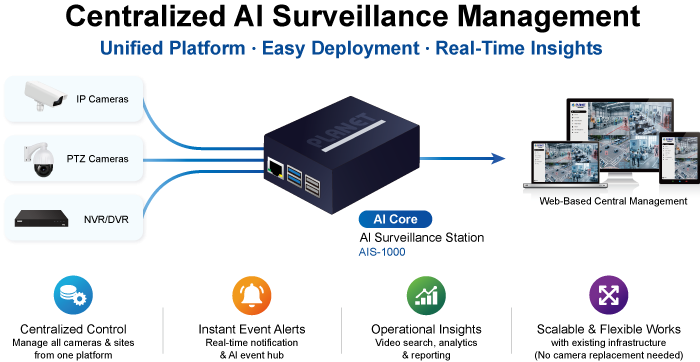 PLANET AIS-1000 представляет собой специализированную станцию видеоаналитики на базе искусственного интеллекта, предназначенную для интеграции в существующие системы видеонаблюдения без необходимости замены парка камер. Устройство функционирует как интеллектуальный узел на границе сети (edge computing), обеспечивая обработку видеопотоков в реальном времени. Благодаря поддержке протокола RTSP, AIS-1000 совместима с IP-камерами различных производителей, что позволяет масштабировать функционал безопасности до уровня интеллектуального мониторинга с минимальными капитальными вложениями.