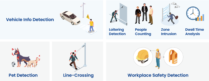 | Детекция людей | Пересечение линии, вторжение в зону, подсчет людей |