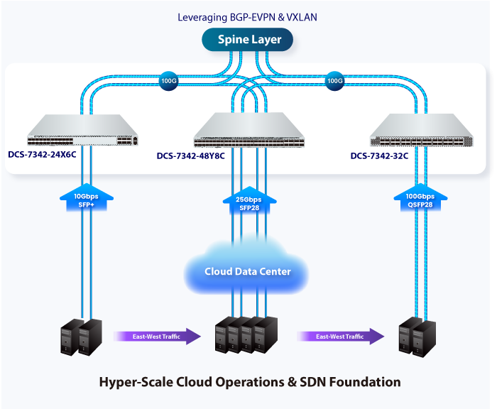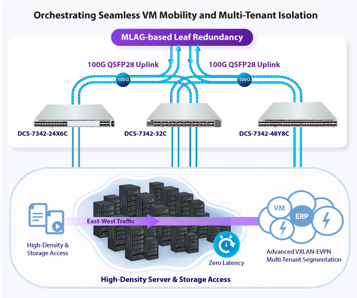 В условиях центров обработки данных (ЦОД) коммутатор DCS-7342-24X6C обеспечивает необходимую плотность портов 100G для организации высокоскоростных магистральных каналов (Uplink) и подключений Spine-Leaf архитектур. Поддержка VXLAN и EVPN позволяет создавать логические сети поверх физической инфраструктуры, что критично для облачных провайдеров и мультиарендных сред, где требуется изоляция трафика и мобильность виртуальных машин.