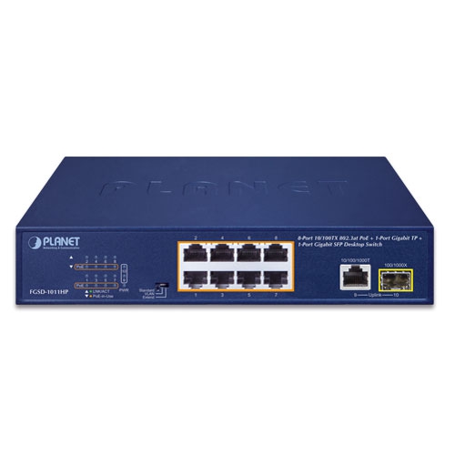 Коммутатор Planet FGSD-1011HP представляет собой неуправляемое устройство, оснащённое 8 портами 10/100 Мбит/с с поддержкой PoE (Power over Ethernet) стандарта IEEE 802.3af/at, одним гигабитным портом 10/100/1000BASE-T и одним гигабитным портом SFP. Общий бюджет PoE составляет 120 Вт, что обеспечивает питание для различных устройств, таких как IP-камеры, точки доступа и IP-телефоны, без необходимости в дополнительных источниках питания.