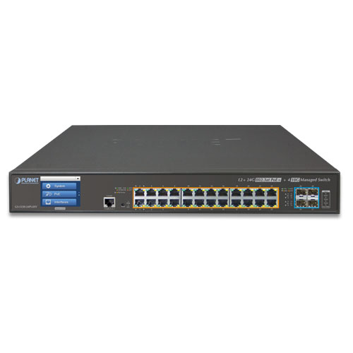 Коммутатор PLANET GS-5220-24P4XVR представляет собой управляемое устройство уровня L2+ с 24 портами 10/100/1000BASE-T, поддерживающими технологию Power over Ethernet (PoE) по стандарту IEEE 802.3at, и 4 портами 10G SFP+ для высокоскоростных соединений. Оснащён сенсорным ЖК-экраном для удобного мониторинга и настройки параметров.