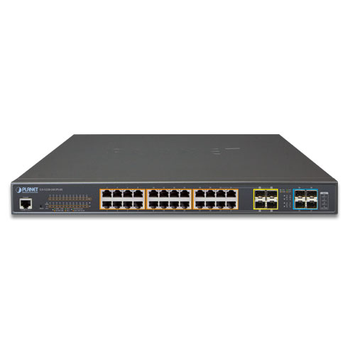 Коммутатор PLANET GS-5220-24PL4XR представляет собой управляемое устройство уровня L2/L3, предназначенное для монтажа в 19-дюймовую стойку. Он оснащён 24 портами 10/100/1000BASE-T с поддержкой стандарта IEEE 802.3at PoE+ и четырьмя слотами для оптических модулей 10G SFP+. Общий бюджет мощности PoE составляет 600 Вт, что позволяет эффективно питать подключённые устройства, такие как IP-камеры, точки доступа Wi-Fi и IP-телефоны.