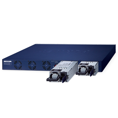 - Гибкая система питания: Наличие двух слотов для модульных блоков питания позволяет реализовать режимы резервного (RPS) и расширенного (EPS) питания. В режиме RPS два блока питания обеспечивают резервирование, а в режиме EPS два блока питания совместно увеличивают общий бюджет PoE до 3200 Вт, что критично для приложений с высокими требованиями к питанию.
