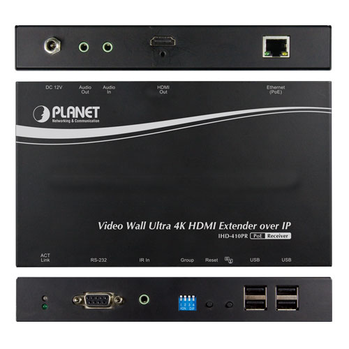 **Video Wall Ultra 4K HDMI/USB Extender Receiver over IP with PoE - Ultra High Definition Digital Sign** (модель IHD-410PR) от компании Planet представляет собой передовое решение для расширения и управления высококачественными видеостенами и цифровыми вывесками.