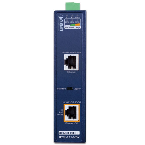 Инжектор питания PoE Planet IPOE-171-60W представляет собой промышленное устройство, предназначенное для передачи данных и питания по одному Ethernet-кабелю. Он обеспечивает выходную мощность до 60 Вт, соответствуя стандарту IEEE 802.3bt PoE++ и поддерживая мультигигабитные скорости передачи данных до 5 Гбит/с.