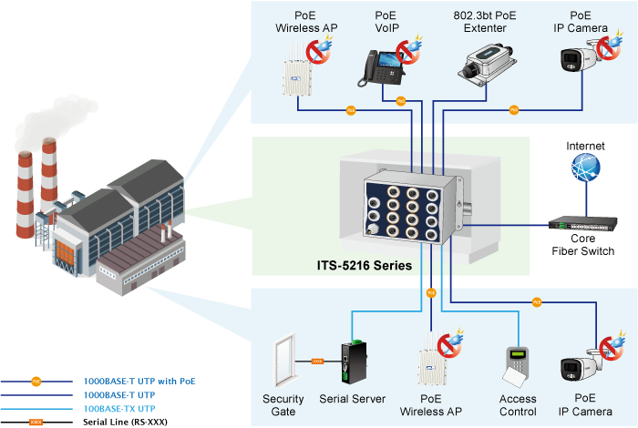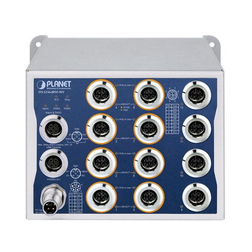 PLANET ITS-5216-8P4T-WV — промышленный управляемый коммутатор уровня L2+ с поддержкой Power over Ethernet Plus, предназначенный для построения надёжных сетей передачи данных в транспортных и промышленных системах. Устройство объединяет восемь портов 10/100/1000BASE-T M12 PoE+ и четыре стандартных M12 Gigabit-порта, обеспечивая устойчивость к вибрациям, пыли и электромагнитным помехам. Коммутатор выполнен в металлическом корпусе с защитой IP50 и рассчитан на эксплуатацию в диапазоне температур от −40 до +70 °C.