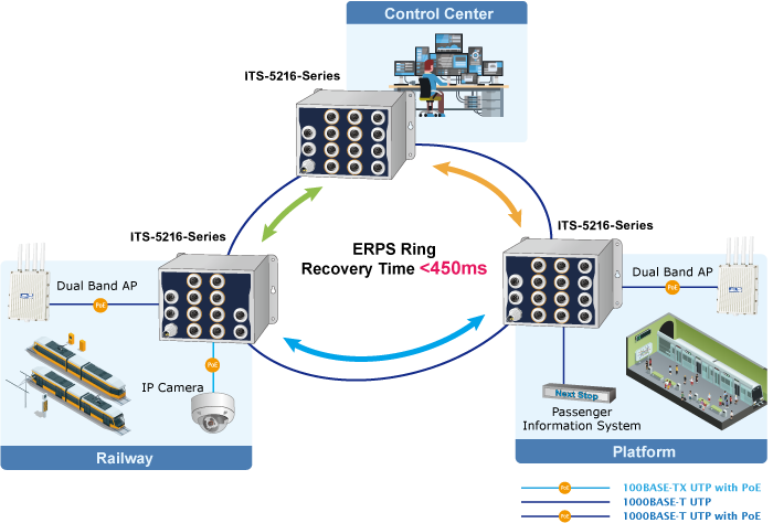 Модель ITS-5216-8P4T-WV реализует функции промышленного коммутатора уровня L2+, включая VLAN (802.1Q, Q-in-Q, Voice VLAN), агрегацию каналов (LACP), Spanning Tree Protocol (STP/RSTP/MSTP), а также кольцевую топологию ERPS (G.8032) с временем восстановления соединения менее 450 мс. Архитектура Store-and-Forward, высокая пропускная способность 24 Гбит/с и 32 K MAC-таблица обеспечивают стабильную работу сети в системах с интенсивным трафиком. QoS, DSCP и приоритизация по классам обслуживания поддерживают корректную работу сервисов реального времени, таких как IP-телефония и видеопередача.